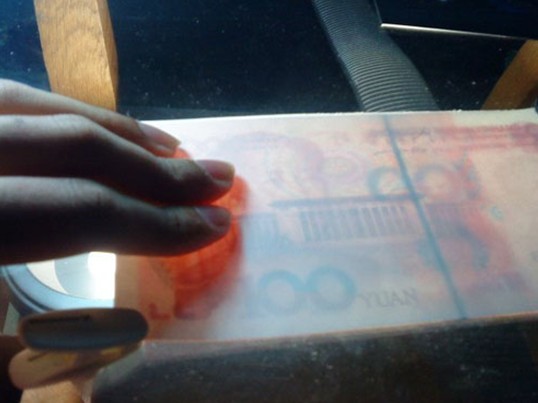 请看 高手 如何 画 出逼真 百元大钞 (文图) 第六步:固定纸于钱上。