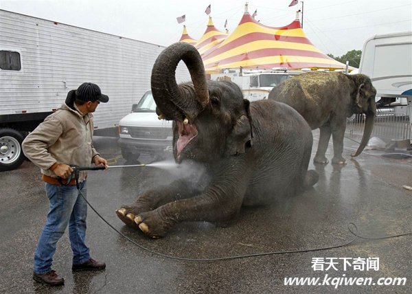 在北卡罗来纳州,星期五,2011年4月22日,驯象师给大象洗澡。